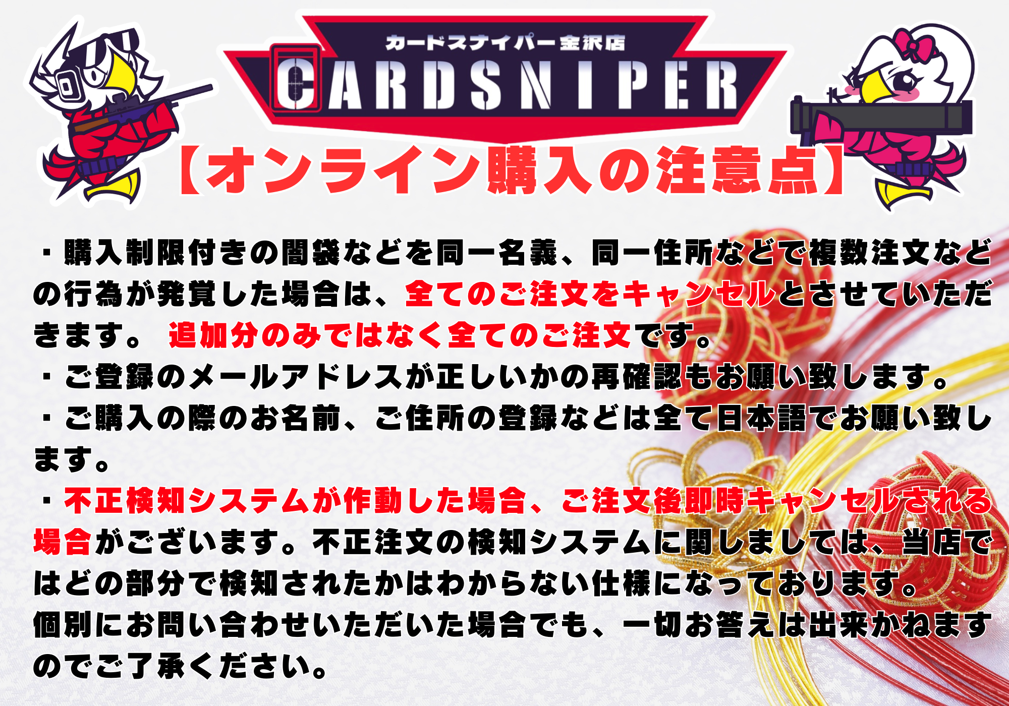 ※不正注文の検知システムに関しましては、当店ではどの部分で検知されたかはわからない仕様になっております。